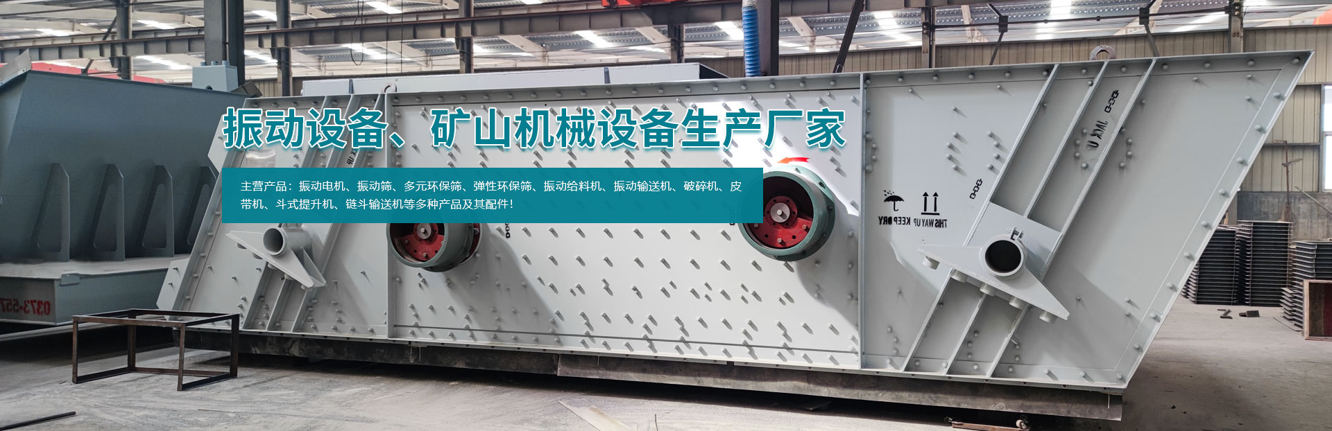 • 主要產品有系列振動電機、振動篩、多元環保篩、彈性環保篩、振動給料機、振動輸送機、破碎機、皮帶機、斗式提升機、鏈斗輸送機等多種產品
